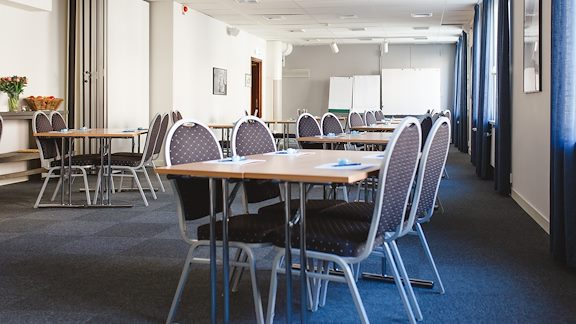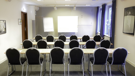 Hammaren & Järnet är vår näststörsta möteslokal på 81 kvm och rymmer upp till 70 personer i biosittning. Lokalen går att antingen använda som en eller två separata möteslokaler. Det går att anpassa och använda lokalen utifrån egna önskemål och behov. Behöver ni t.ex. dela upp er i mindre grupper passar Hammaren & Järnet utmärkt. Lokalen är utrustad med full utrustning som PC-projektor, Whiteboard, blädderblock, ljudsystem över hela lokalen, block och pennor.